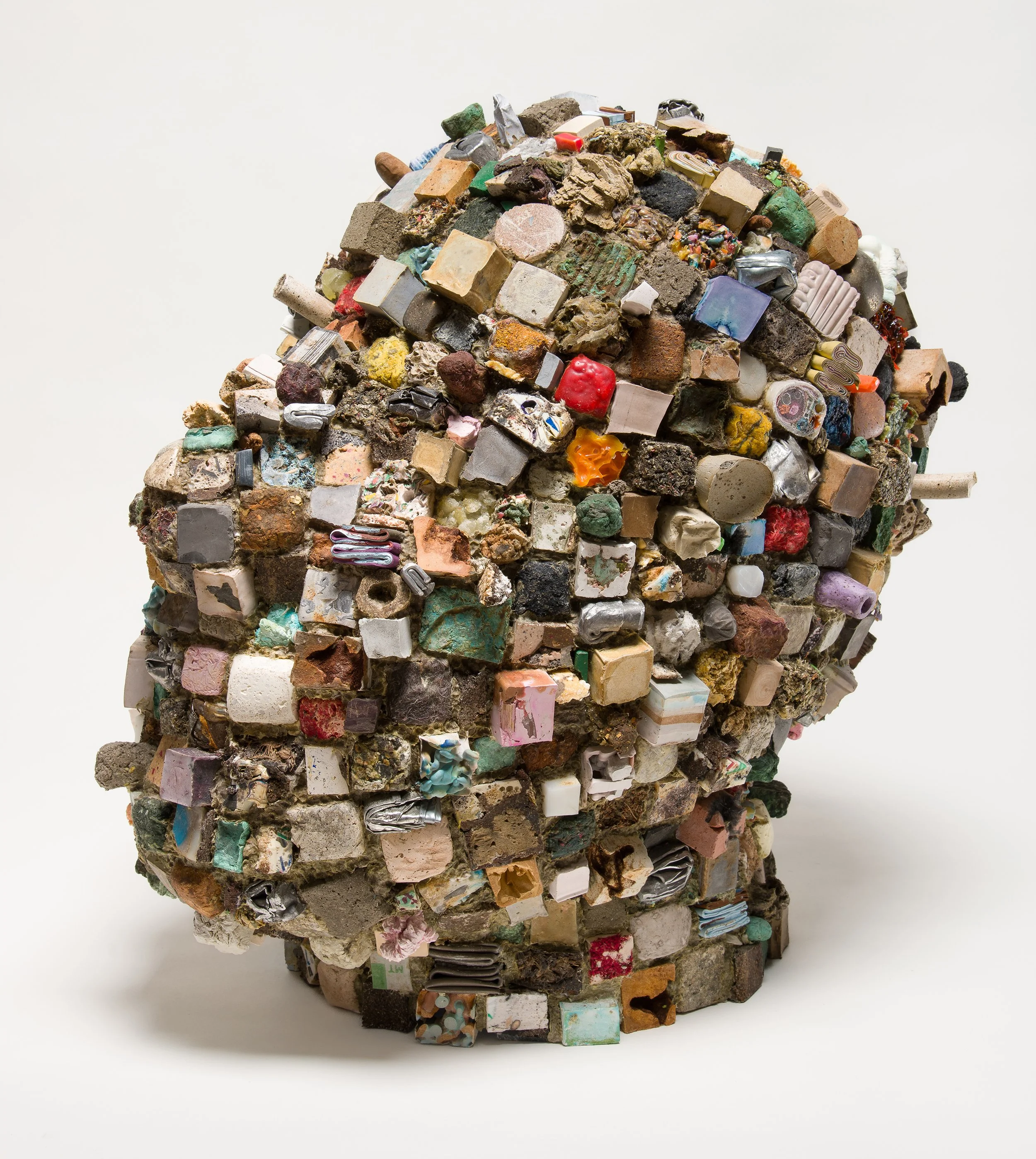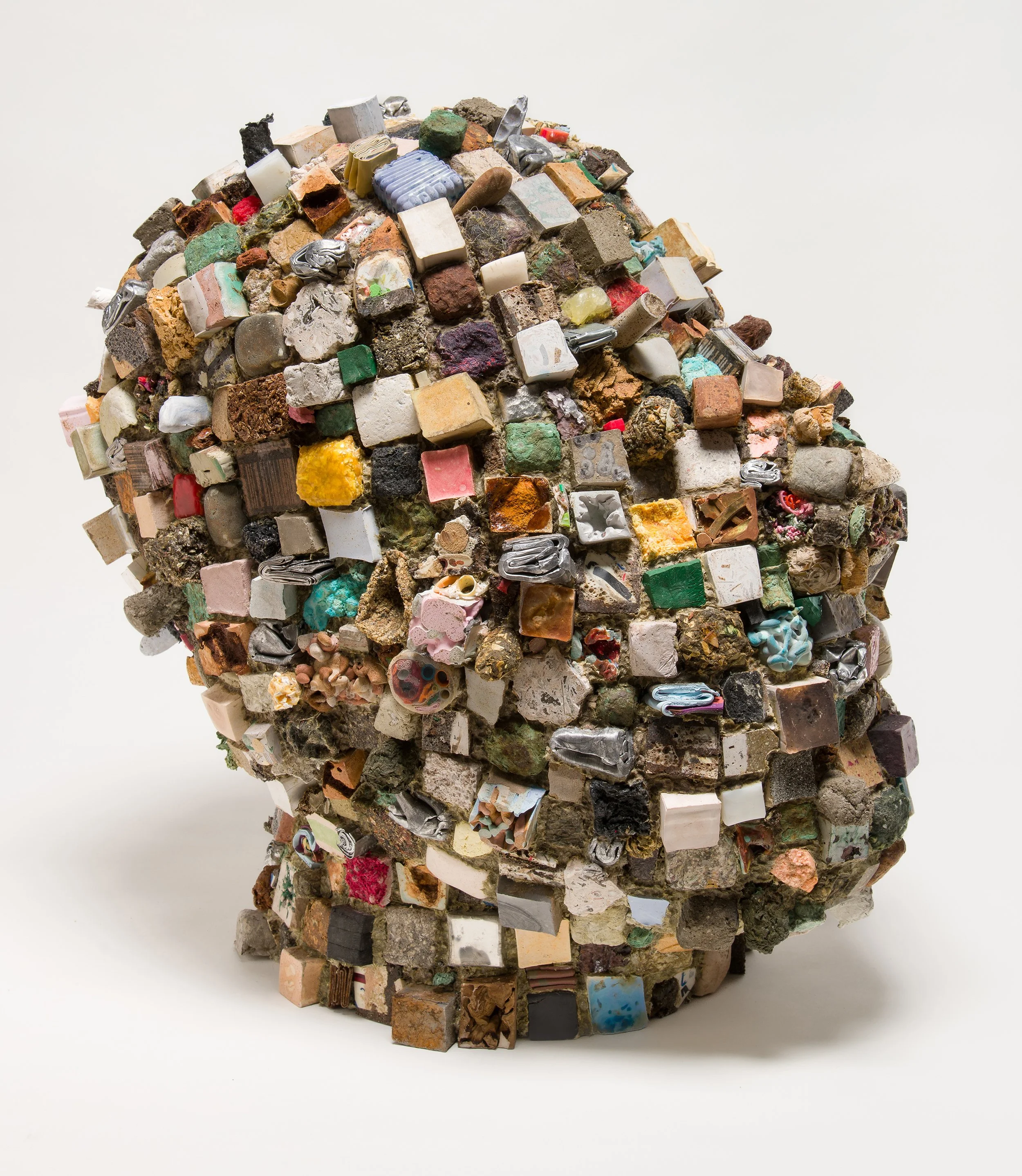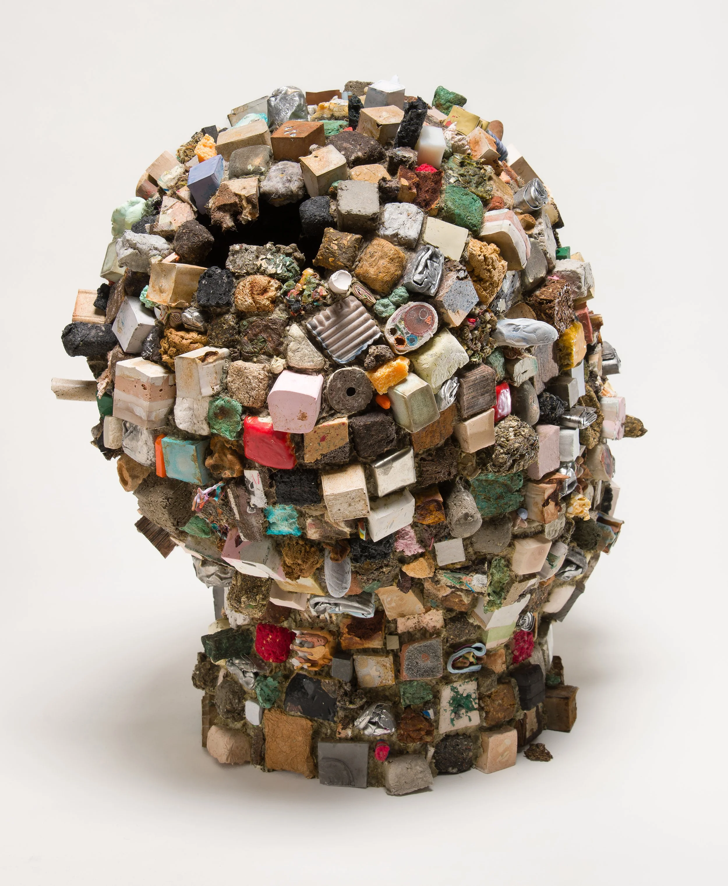 Untitled (Big Head), 2025, 19.5 x 13 x 20 inches, Burdock, steel pie pan, marker, Verona Red marble, copper, Hydrocal, sculpture dust, saw dust, beer can, t-shirt, lichen, railroad rust, white pine needles, dish sponge, soup can, Earl Grey tea, rabbit fur, white marble dust, asphalt, basement grit, aronia, blue foam, pewter cup, corn, latex paint, resin, plastics, burrs, linen, oak tannins, packaging foam, ebony, wine, pencil, structural foam, Pepto Bismol, sulphur, underwear, 100% cashmere, Durham’s Water Putty, toilet paper, mica, microplastics, shale, aluminum can, nail polish, dryer lint, milk weed, cornmeal, poppyseeds, glass, epoxy, iron oxide, perlite, coffee, desiccant, Monkton Quartzite, cottonwood cotton, very small steel bucket, pajamas, burrs, soot, oats, underwear, white marble, bronze, maple seeds, alcohol ink, produce netting, bioplastic, holly wood, cabbage, apple seeds, oak, brick, Old Overholt, hazel nut broth, shellac, bone, bubble wrap